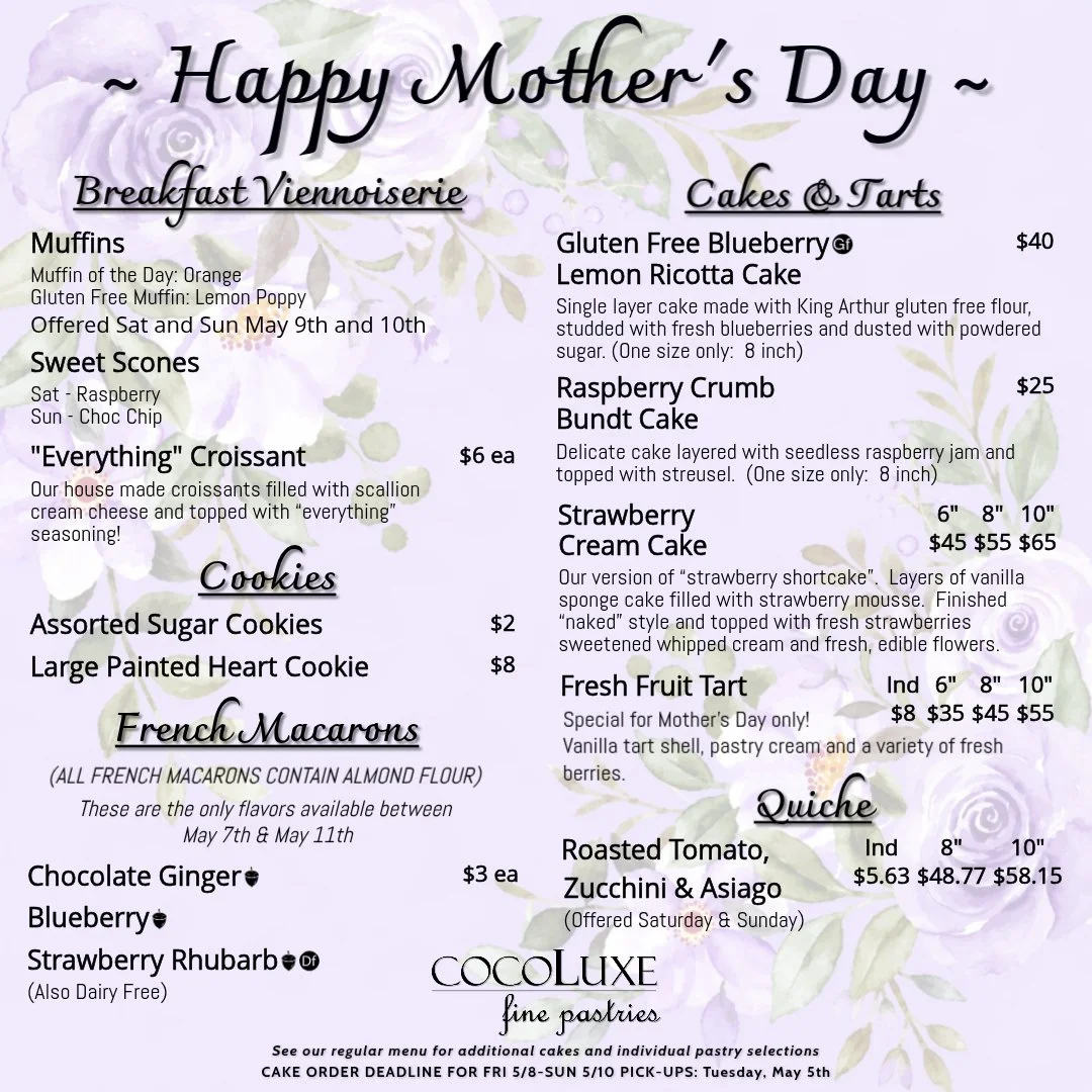 🗓️ Cake Order Deadline for pickup Fri, 5/8–Sun, 5/10 (Including all menu cakes):