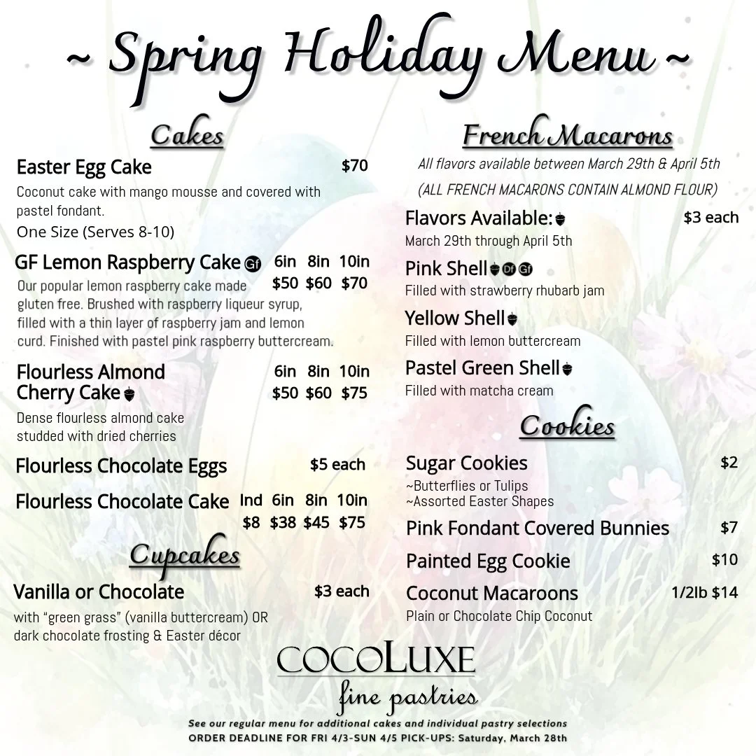 Our Spring Menu is here ✨ Egg Cakes, Flourless Chocolate Eggs & festive Sugar Cookies—perfect for your holiday table!